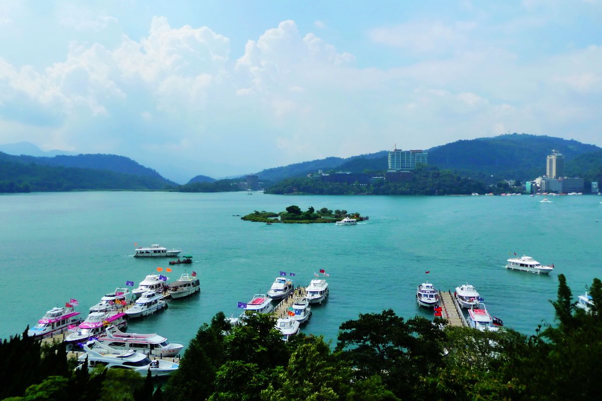 有點扯遠了,再說日月潭,就我所見來說,日月潭雖然比不上杭州西湖、淳安千島湖的綺麗之美,也沒有新疆、長白山天池的高峻之美,但確有其獨特韻味之處。由于人的審美觀差異,一些人去了卻覺得不過如此,日月潭也僅是一個水庫而已。據(jù)介紹,日月潭湖面遼闊,水域面積達9平方公里,平時水深30多米。湖中有一小島,遠看好像浮在水面上的一顆珠子,所以這個小島被叫做“珠子嶼”,現(xiàn)在也叫光華島(又稱拉魯島)。以這個島為界,湖的北半部分圓圓的形同日輪,湖的南半部分彎彎的形如月鉤,故名“日月潭”。據(jù)說最早時日月潭只是個小湖泊,日本人占據(jù)時代,為了發(fā)電所需,在其上游攔砂引水,修筑了一條長