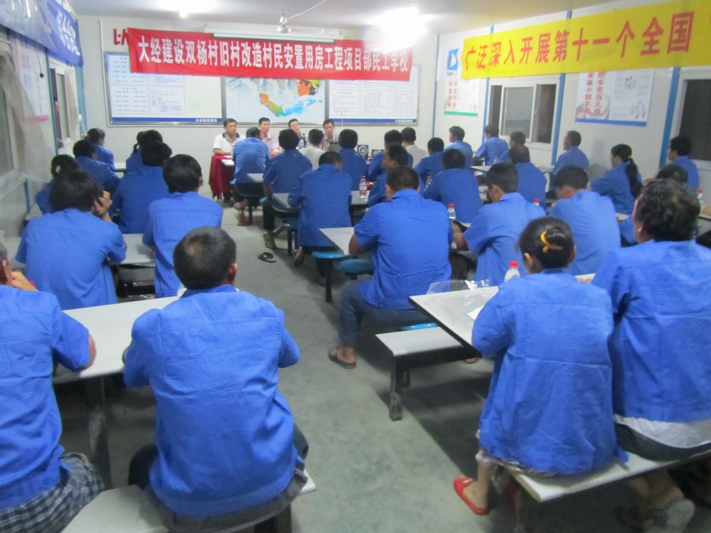 由于人數(shù)和教學(xué)環(huán)境的原因,此次在建農(nóng)民工學(xué)校的首堂課就開(kāi)在雙楊村舊村改造村民安置用房項(xiàng)目部的食堂里。“施工也應(yīng)知行結(jié)合,來(lái)我們工地施工的大多只有小學(xué)到初中文化程度,公建方面的理論知識(shí)并不扎實(shí),我們希望通過(guò)這種形式,開(kāi)拓他們的眼界,提高技術(shù)能力,夯實(shí)我們建筑的基礎(chǔ)?!表?xiàng)目負(fù)責(zé)人周衍錢告訴記者,農(nóng)民工業(yè)余學(xué)校將是一項(xiàng)長(zhǎng)期而繁瑣的工作,農(nóng)民工教育培訓(xùn)活動(dòng)將通過(guò)聘請(qǐng)有關(guān)專家講課、放映學(xué)習(xí)光盤等形式,從思想道德、法律法規(guī)、依法維權(quán)、施工安全生產(chǎn)、專業(yè)技能等方面對(duì)農(nóng)民工進(jìn)行系統(tǒng)教育培訓(xùn),促使其對(duì)自身和工作正確定位,提高文化水平和職業(yè)技能水平,真正將業(yè)余學(xué)校辦成農(nóng)民工提高素質(zhì)的“加油站”。