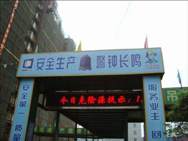 1、現(xiàn)場(chǎng)入口醒目處設(shè)置LED電子顯示屏,滾動(dòng)播放今日重大危險(xiǎn)源,促進(jìn)現(xiàn)場(chǎng)安全宣傳和提醒。